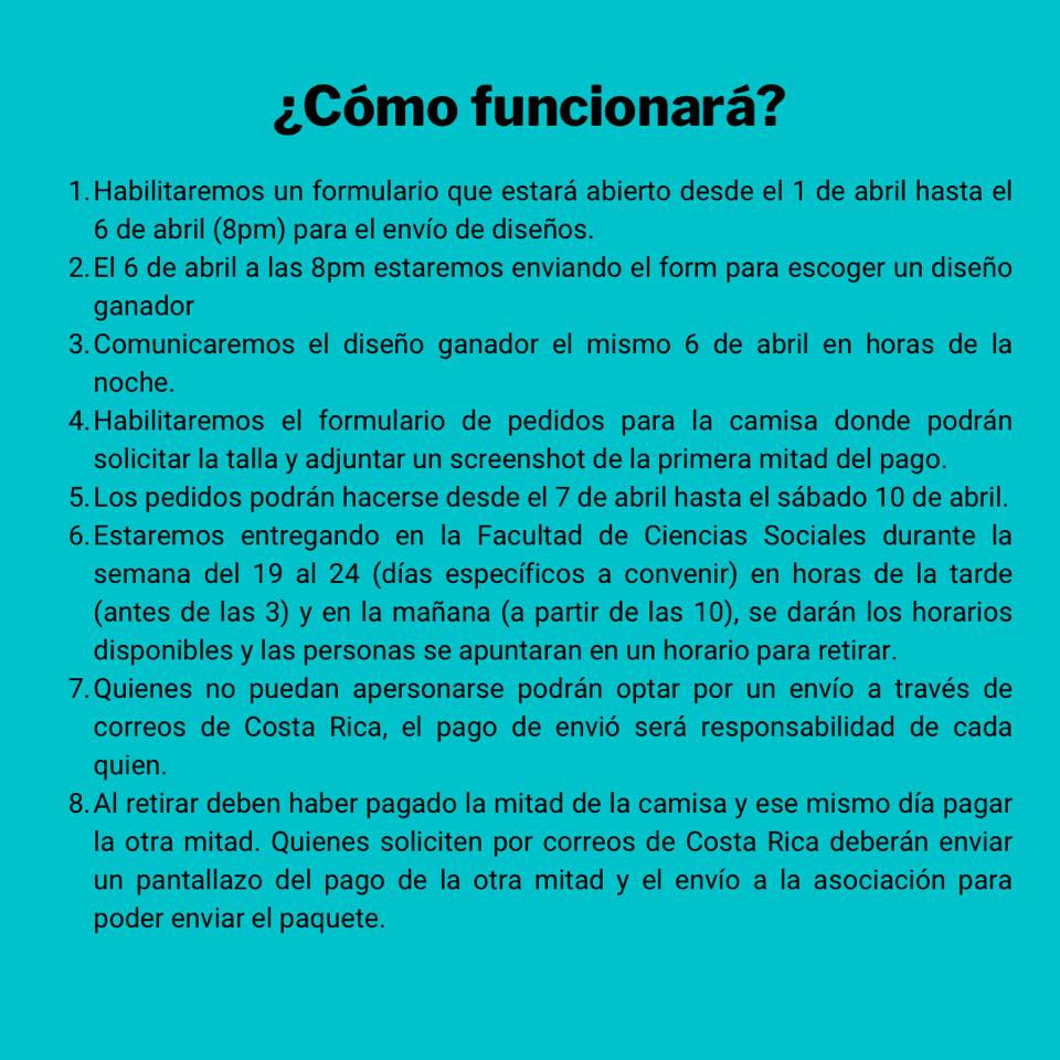 1.Habilitaremos un formulario que estará abierto desde el 1 de abril hasta el 6 de abril (10pm) para el envío de diseños. 2.Comunicaremos el diseño ganador el mismo 6 de abril en horas de la noche. 3.Habilitaremos el formulario de pedidos para la camisa donde podrán solicitar la talla y adjuntar un screenshot de la primera mitad del pago. 4.Los pedidos podrán hacerse desde el 7 de abril hasta el sábado 10 de abril. 5.Estaremos entregando en la Facultad de Ciencias Sociales durante la semana del 19 al 24 (días específicos a convenir) en horas de la tarde (antes de las 3) y en la mañana (a partir de las 10), se darán los horarios disponibles y las personas se apuntaran en un horario para retirar. 6.Quienes no puedan apersonarse podrán optar por un envío a través de correos de Costa Rica, el pago de envió será responsabilidad de cada quien. 7.Al retirar deben haber pagado la mitad de la camisa y ese mismo día pagar la otra mitad. Quienes soliciten por correos de Costa Rica deberán enviar un pantallazo del pago de la otra mitad y el envío a la asociación para poder enviar el paquete.